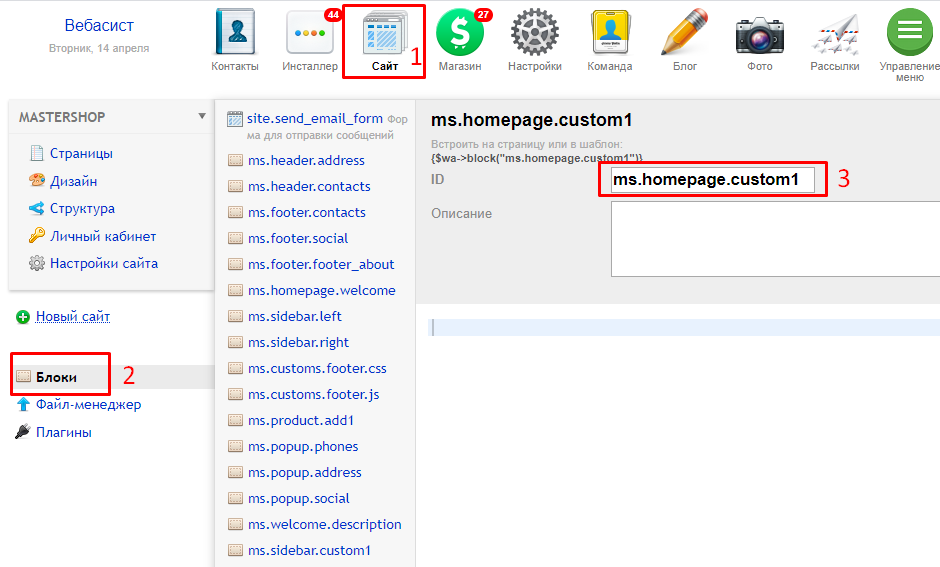 3. Далее, перейдите в приложении Сайт - Блоки и создайте блок с идентификатором ms.homepage.custom1: