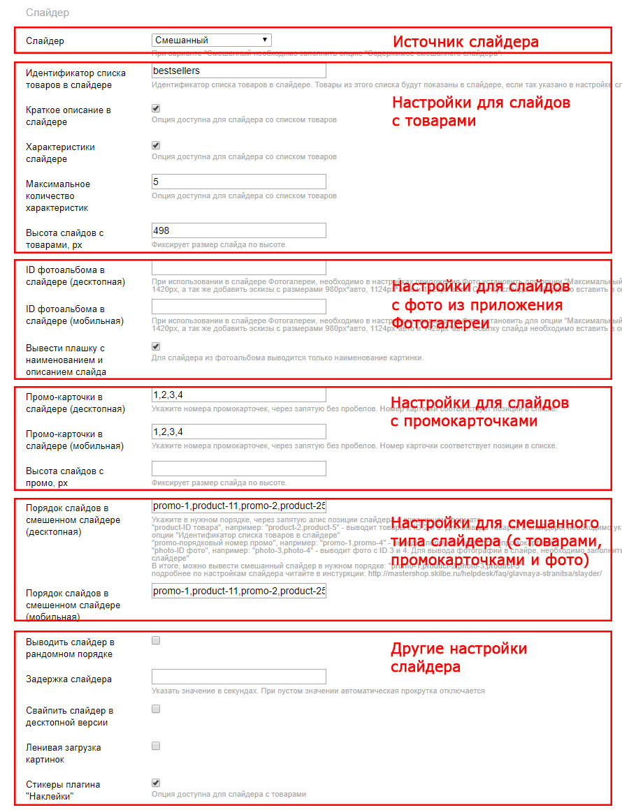 6. Для вывода вместе товаров, промо и фото в слайдере, в опции Слайдер выберите вариант "Смешанный". Также, для товаров необходимо заполнить опцию Идентификатор списка товаров в слайдере (как описано в 3 пункте), а для фото заполнить опцию ID фотоальбома в слайдере (как описано в 5 пункте инструкции).