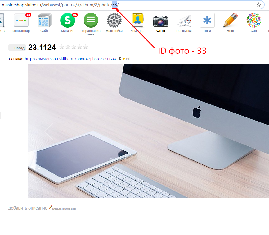 - Для фото: photo-[ID фото]. Вместо [ID фото], необходимо ввести идентификатор фото, например: photo-8. Идентификатор фото можно узнать на странице фото в админке, в адресной строке. На скриншоте показан пример фото с идентификатором 33:
