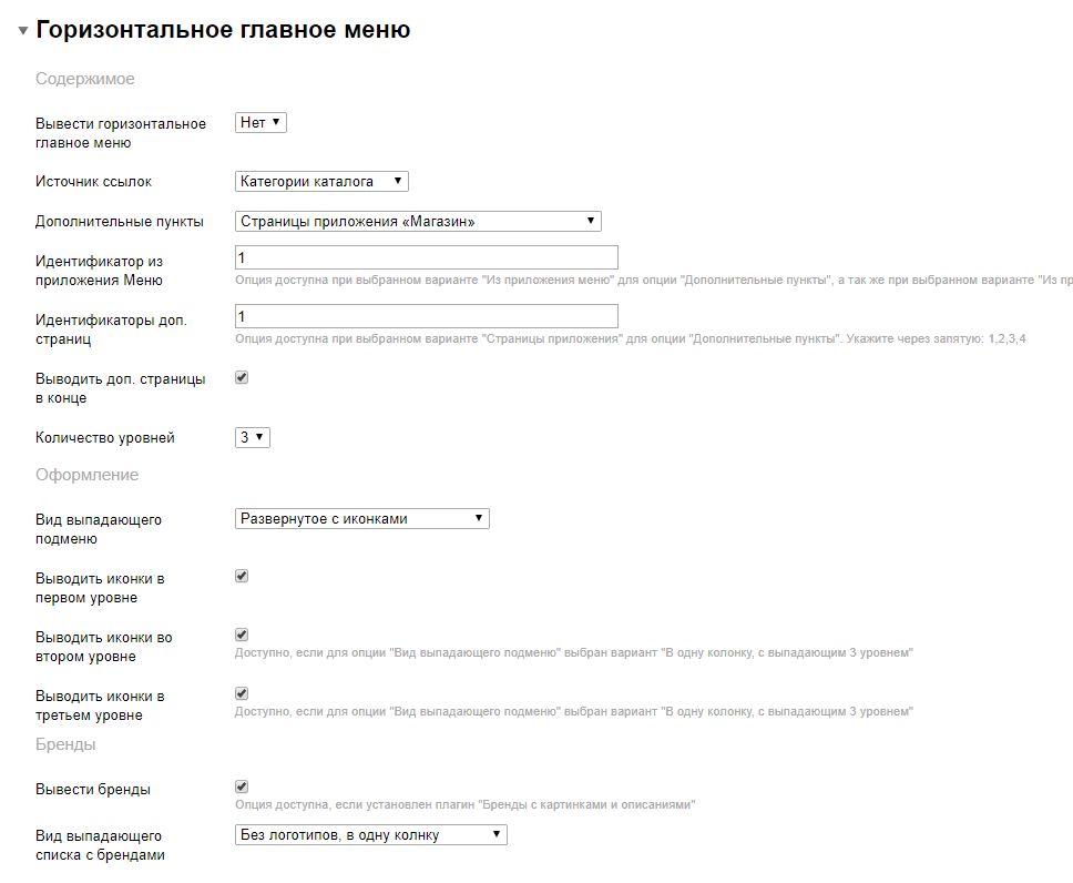 1. Опции по управлению горизонтального меню находится в разделе "Горизонтальное главное меню":