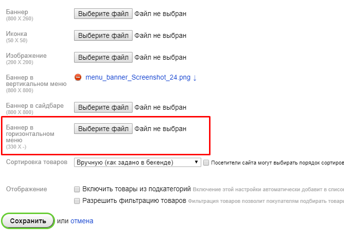 7. Для загрузки баннера, необходимо настроить плагин "Изображения для категории" по инструкции. Далее, в настройках категории загрузить картинку в опцию "Баннер в горизонтальном меню":