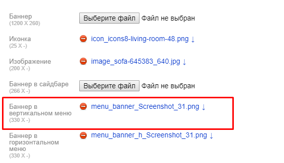 8. Для загрузки баннера, необходимо настроить плагин "Изображения для категории" по инструкции. Далее, в настройках категории загрузить картинку в опцию "Баннер в вертикальном меню":