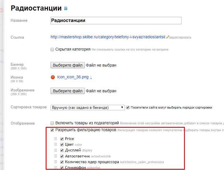8. Список фильтров формируется из настроек категории: включите опцию "Разрешить фильтрацию товаров" и выберите характеристики по которым необходима фильтрация.