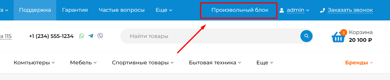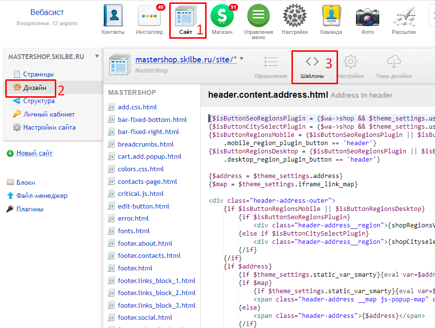1. Некоторые области на сайте, такие как контакты в шапке или в подвале можно выводить с помощью блоков из приложения Сайт -> Блоки. Это может понадобиться для редактирования html-разметки области, так как после обновления темы не нужно будет повторно вносить изменения.