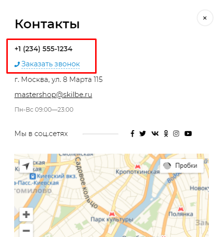 Опция для переключения блока - "Выводить контакты в попап-окне (моб. версия)" в разделе Шапка сайта