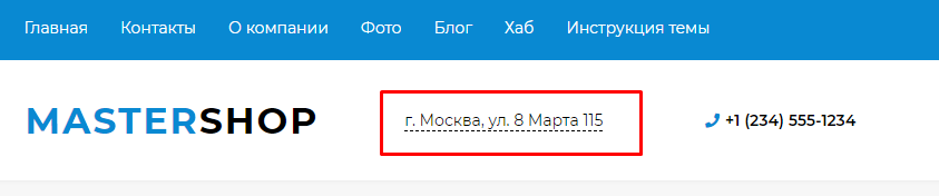 Для этого в настройках сайта, в разделе Шапка сайте, переключите опцию Выводить адрес на вариант "Подключаемый блок". В описании опции указывается, идентификатор, который нужно указать при создании блока и файл с html-разметкой блока: