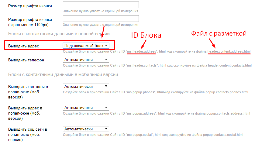 Далее, перейдите в приложение Сайт - Блоки - кнопка "Новый блок". В поле ID укажите: ms.header.address: