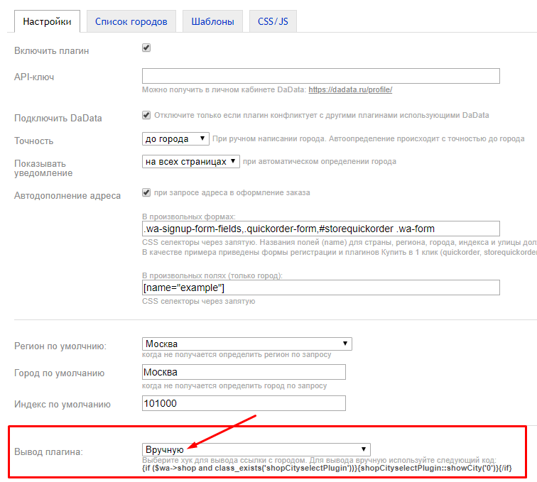 1. В настройках плагина (приложение Магазин -> Плагины) переключите опцию "Вывод плагина" на вариант "Вручную":