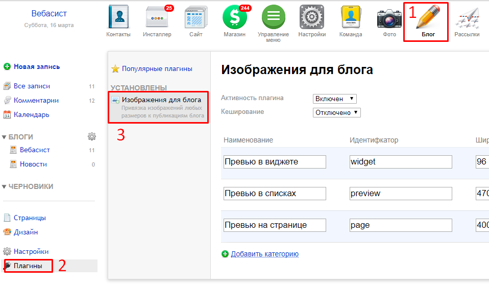 1. Перейдите в приложение Блог -> Плагины -> Изображения для Блога: