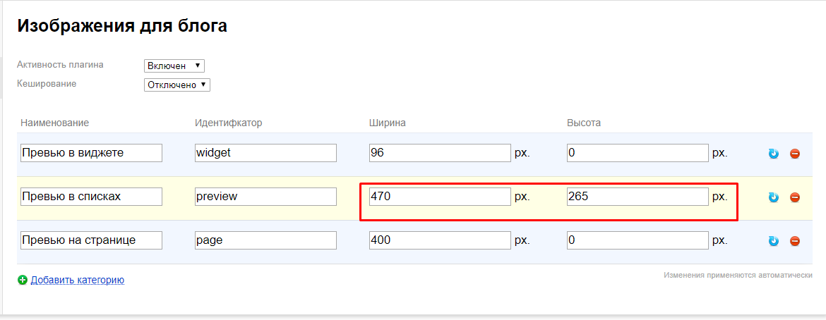 2. Настройте размеры картинки "Превью в списках" как на скриншоте: