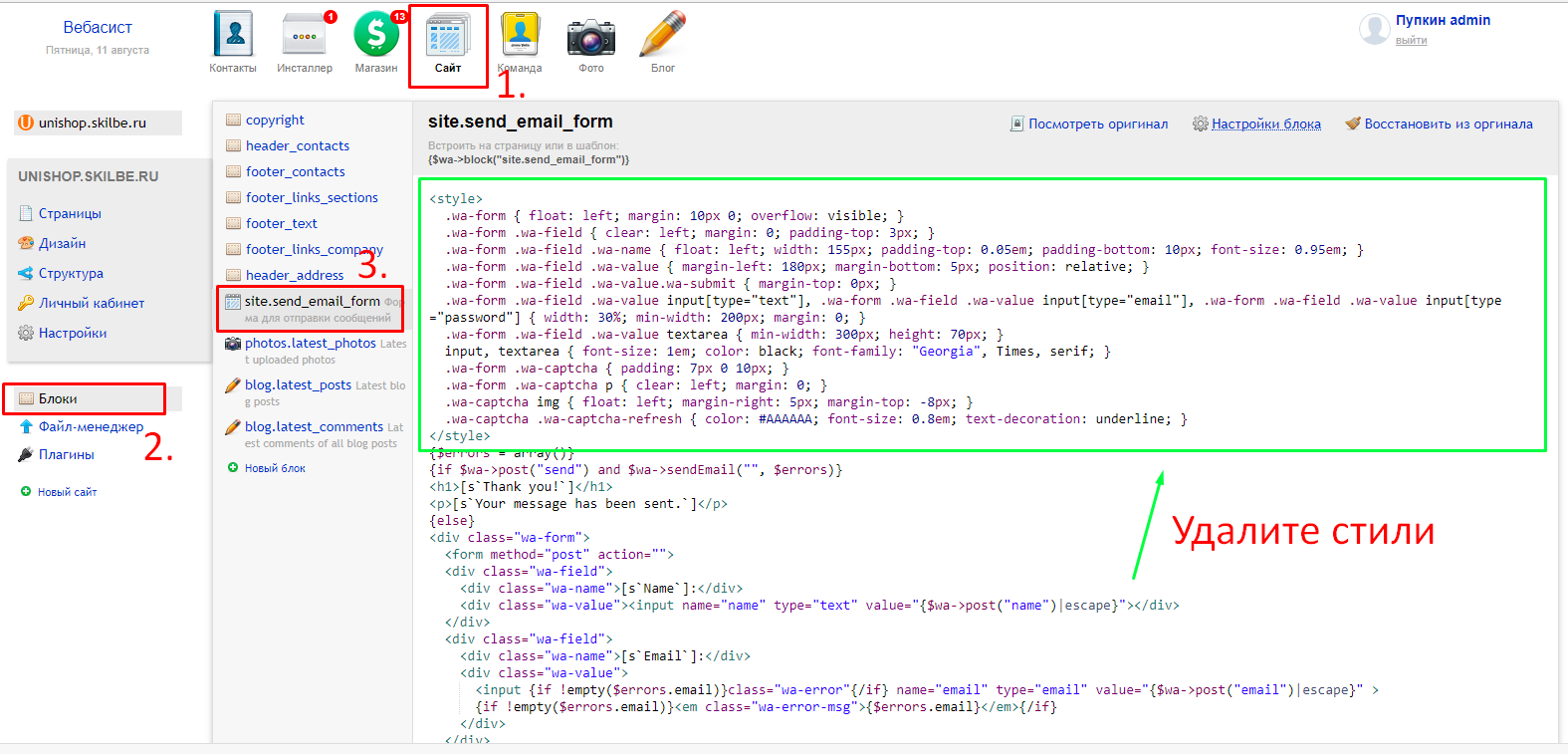 3) Для формы обратной связи, в приложении Сайт - Блоки - Блок с id site.send_email_form удалите стили: