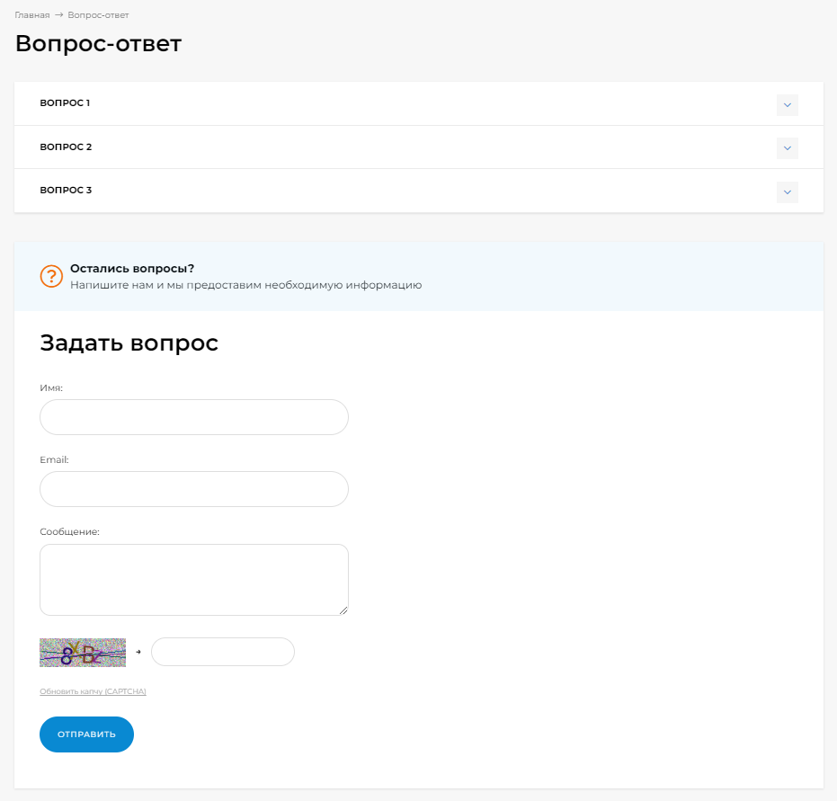 В теме предусмотрено оформление страницы Вопрос-ответ. В форме "Остались вопросы" используется стандартная форма обратной связи движка: