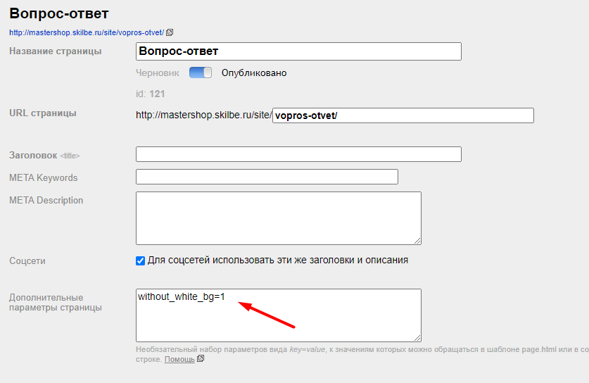 2) В настройках страницы в дополнительных параметрах пропишите параметр without_white_bg=1:
