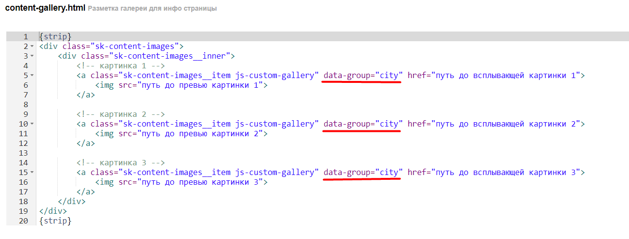 2. В ссылке на картинку укажите параметр data-group с одинаковым значением для картинок, которые должны перелистываться между собой:
