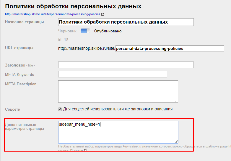 3. При необходимости в меню можно скрыть определенную страницу. Для этого перейдите в редактирование страницы и пропишите в опции "Дополнительные параметры" с новой строки sidebar_menu_hide=1