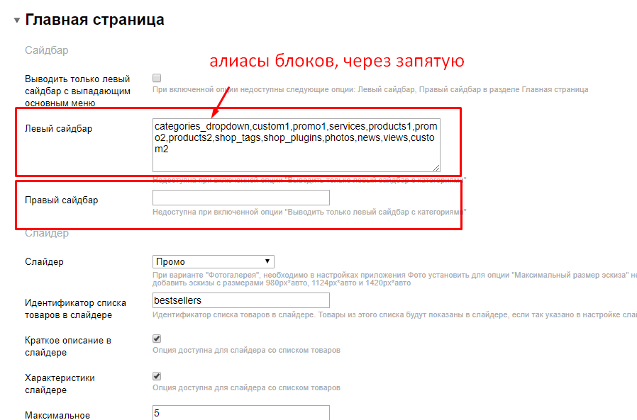 3. Опции заполняются алиасами блоков, через запятую, без пробелов, в том порядке, в котором необходима сортировка блоков. Список блоков с их алиасами, которые можно вывести в сайдбарах перечислен ниже в таблице.