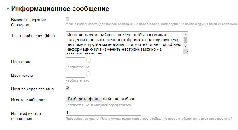 Для информационного сообщения можно задать текст (поддерживает html, можно задавать ссылки), цвет фона, цвет текста, иконку и идентификатор. Сообщение показывается единожды каждому пользователю, уникальность управляется идентификатором, т.е. при смене идентификатора сообщение будет вновь показано всем пользователям (новое сообщение).