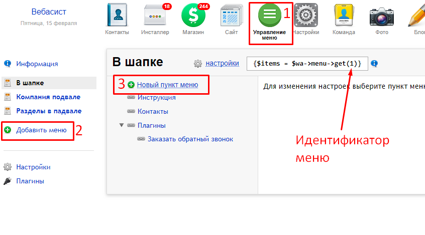 4. При выбранном варианте "из приложения Управление Меню" необходима установка приложения. После создания меню, в настройках темы заполните опцию "Идентификатор из приложения Меню". Идентификатор нужно скопировать из настроек созданного меню. Например, на скриншоте ниже, показано меню с идентификатором: 1
