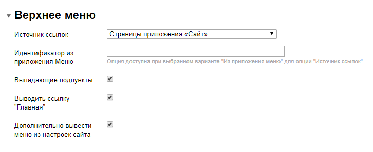 5. Опция "Дополнительно вывести меню из настроек сайта" позволяет дополнительно вывести ссылки из настроек приложения Сайт. Опция может понадобиться, например, если Источником ссылок являются страницы какого-либо приложения. Интерфейс меню настроек сайта:
