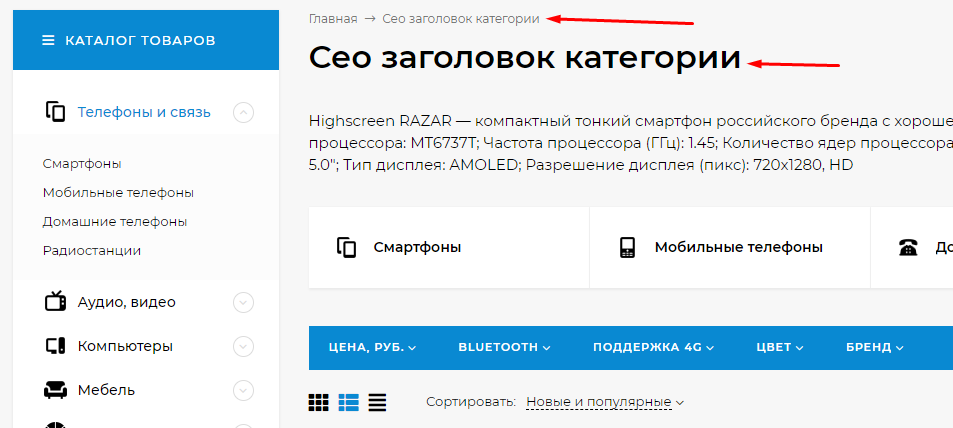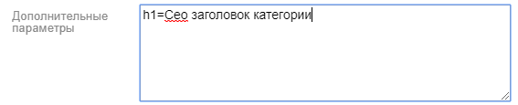 Если есть необходимость вывести отличное от наименования категории содержимое в тег h1, то используйте дополнительный параметр h1=Заголовок на странице категории в настройках категории: